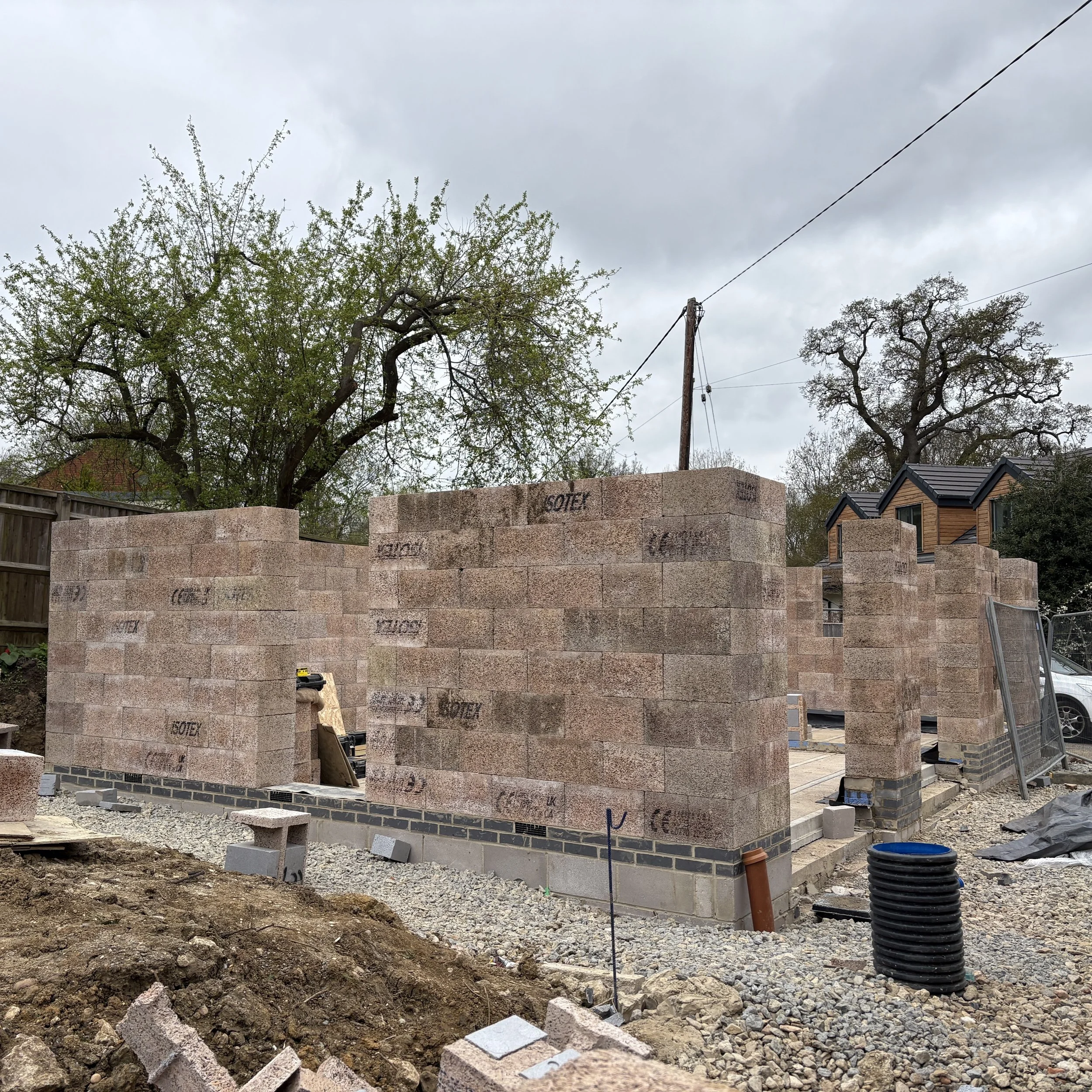 The system offers a thermally/acousticslly efficient alternative to a traditional masonry build with a ‘Lego-like’ modular construction method which also allows for extremely easy, safe and fast assembly on site. The blocks are made from woodcrete with integrated insulation and form both the structural and thermal envelope in one complete system which simplifies the wall build up and brings a cost efficiency benefit with it. In the past week, the project has flown up from the slab level and is ready for the first floor joists and next level to be installed.